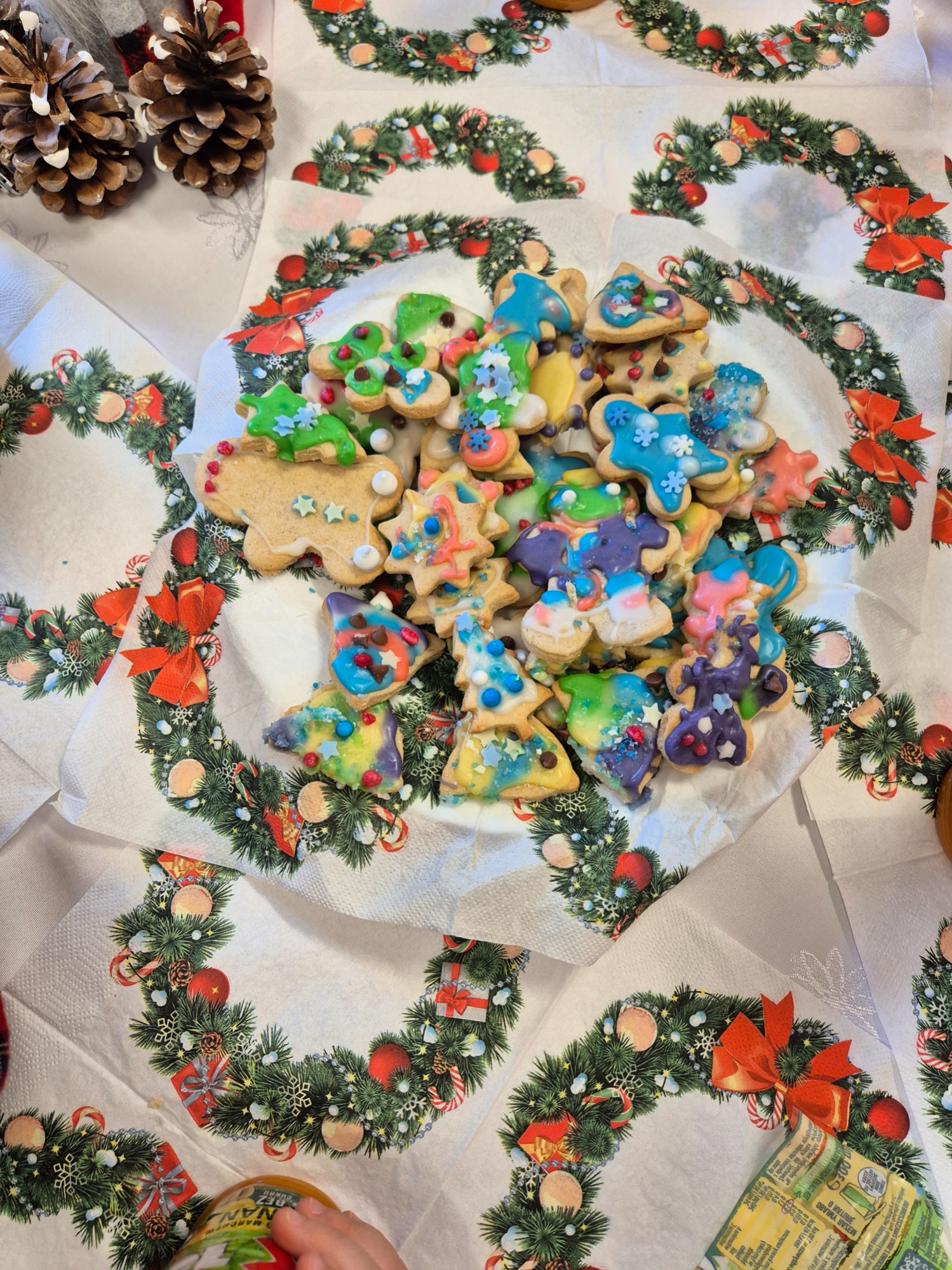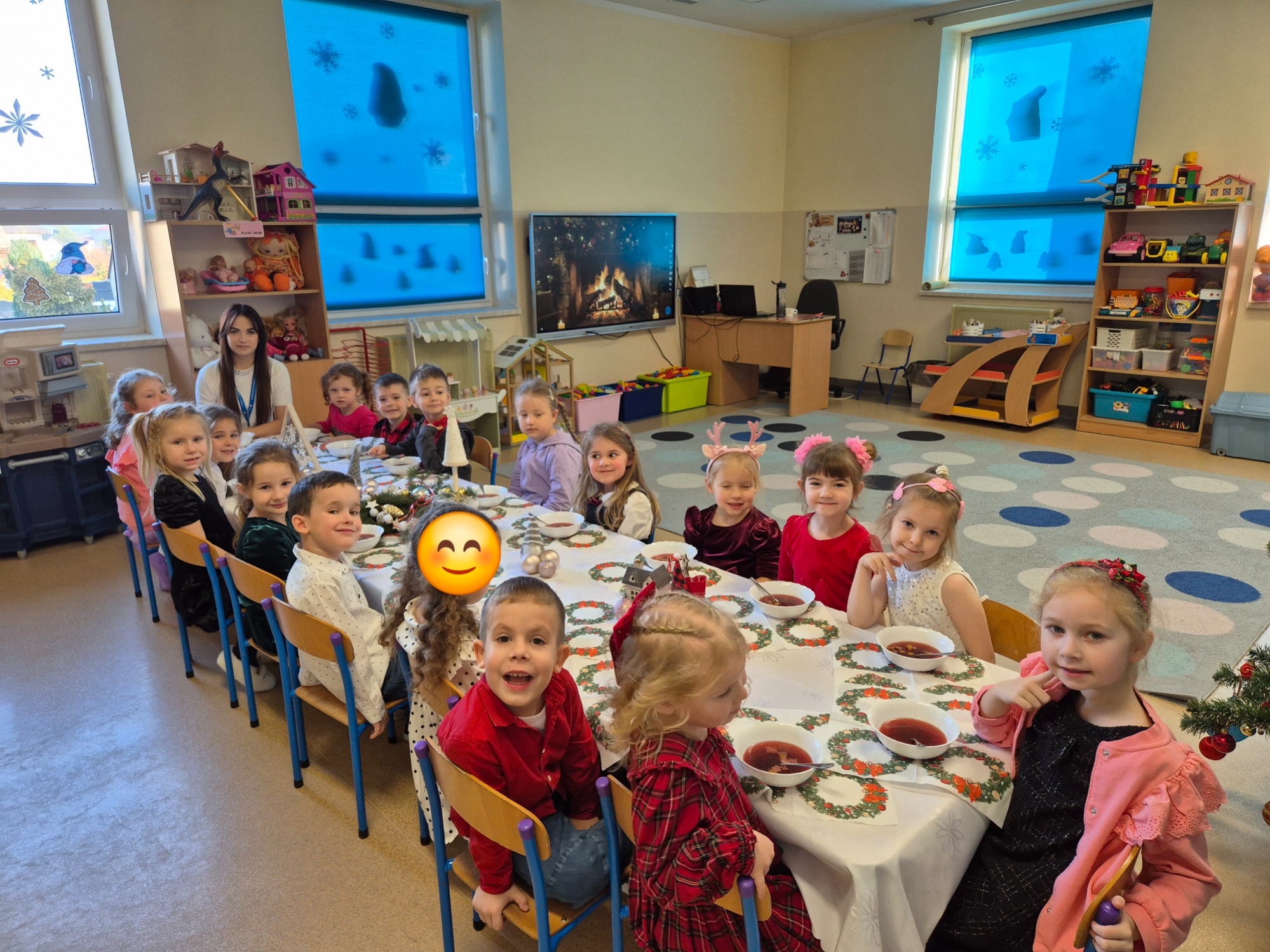 W świątecznej atmosferze, pełnej radości i ciepła, w grupie Sówki odbył się wyjątkowy obiad świąteczny 🎄. Dzieci wspólnie zasiadły do stołu, celebrując ten magiczny czas pełen życzliwości i świątecznych smaków. Dzieci po obiedzie zjadły własnoręcznie ozdobione ciasteczka.